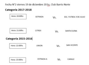 Este viernes 19 de diciembre se jugará la 2da. fecha del Campeonato de Fútbol organizado por el C. A. Barrio Norte, un torneo esperado y que ya se instaló en los aficionados a estas categorías.